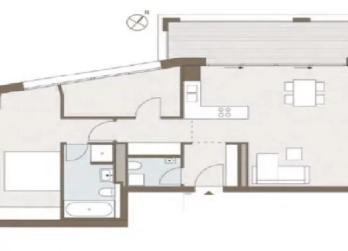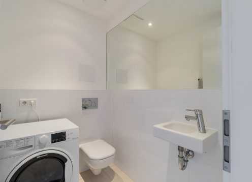 Die Wohnung ist voll ausgestattet und hochwertig eingerichtet, liegt im 2.OG und verfügt über Flur, Wohn- und Essbereich mit Einbauküche, großzügige Terrasse, Gästetoilette, Arbeitszimmer, Schlafzimmer mit en-suite Badezimmer mit bodengleicher Dusche und Wanne, Kellerraum.