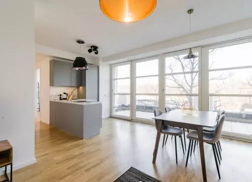 The flat is fully equipped and furnished to a high standard, located on the 2nd floor and has a hallway, living and dining area with fitted kitchen, spacious terrace, guest toilet, study / guest room, bedroom with en-suite bathroom with floor-level shower and tub, cellar room.
